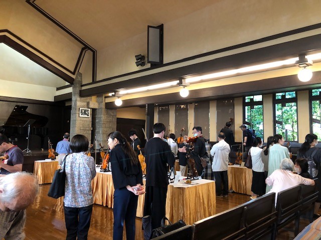 会場では時間を区切り、展示作品を使用したミニコンサートを行います。一流演奏家による生演奏もお楽しみください。2日間で50台程度の楽器が順番に演奏に使用されます。同じ条件で聴き比べることができますので、会員の技術向上を図る場ともなっています。