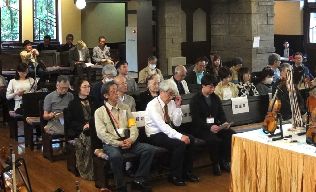 第20回 日本バイオリン製作研究会 春の作品展示会は昨年に続き自由学園明日館講堂で行われました。21名の正会員、2名の準会員、斎藤範夫さんの生徒さん1人が出展され、バイオリン31台、ビオラ8台、チェロ5台の合計45台の楽器が出展されました。初日はあいにくの雨でしたが、2日目は好天に恵まれました。